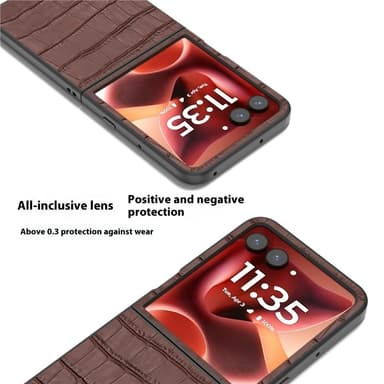 Tämä tyylikäs puhelinkotelo on valmistettu aidosta lehmännahasta ja PC-materiaalista, tarjoten ylellisen tuntuman ja suojan päivittäistä kulutusta vastaan. Krokotiilikuvioitu lehmännahkapinta yhdistää kestävyyden ja tyylin, tehden kotelosta täydellisen valinnan erottuvaan ilmeeseen. Korotetut reunat kameran ja näytön ympärillä suojaavat naarmuilta ja iskuilta. Tarkat leikkaukset takaavat helpon pääsyn kaikkiin portteihin ja toimintoihin. Kotelon langaton lataustuki lisää käyttömukavuutta.