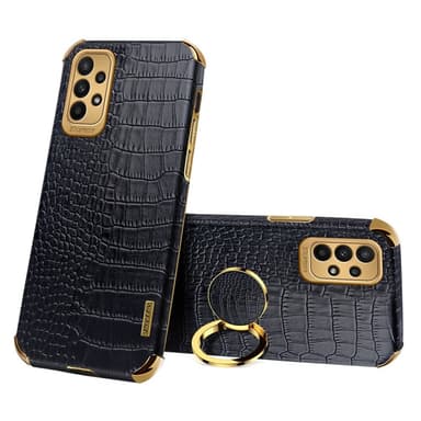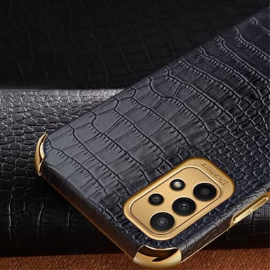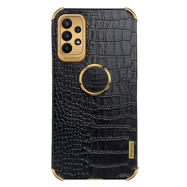 Krokotiilikuvioinen PU-nahkakuori kultaisilla yksityiskohdilla. Takapuolella oleva rengas irtoaa valmiiksi kiinnitetyllä kaksipuolisella teipillä.