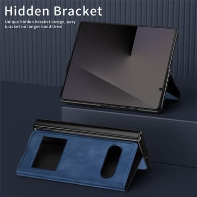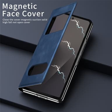 Tyylikäs kotelo, valmistettu nappapintaisesta PU-nahasta ja PC-sisäkuoresta, tarjoaa kestävän ja pehmeän tuntuman. Etukannessa on läpinäkyvä ikkuna, josta näet kellonajan, puhelut ja ilmoitukset yhdellä silmäyksellä. Magneettisuljin pitää kannen tiukasti kiinni ja estää tahattomat avautumiset. Sisäänrakennettu jalusta mahdollistaa mukavan katselun videoille, lukemiselle tai videopuheluille ilman käsiä. Kotelon suojaus estää naarmut, sormenjäljet ja arjen kulumat, ja kaikki portit ja painikkeet ovat helposti käytettävissä.