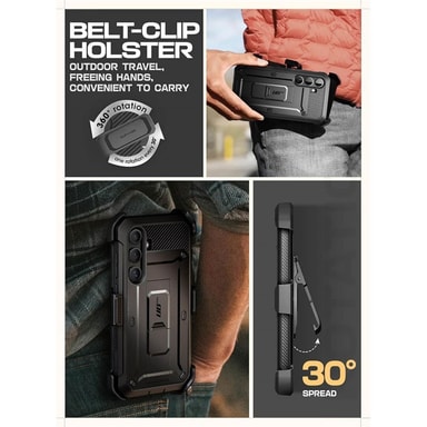 Suojakuoressa on sisäänrakennettu jalusta, joka voidaan taittaa esiin tarpeen mukaan. Lisäksi mukana tulee käytännöllinen vyöpidike, jolla kuori voidaan kiinnittää vyöhön.