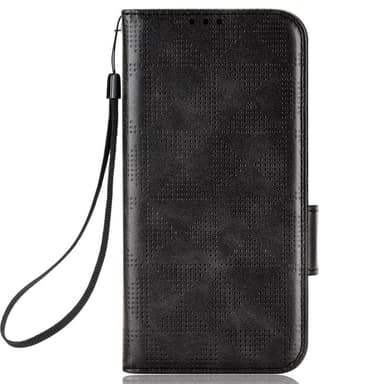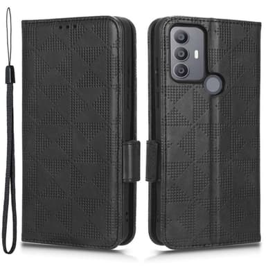 TCL 30 SE/30E/305/306 Painettu kolmiokuvioinen PU-nahkainen lompakkoteline Magneettinen sulkeminen Foliokotelo rannehihnalla - musta PU-nahkainen ulkokerros ja pehmeä TPU-sisäkuori, kaksoissuojaus Kolmioku vio, tyylikäs ja ainutlaatuinen lompakko, heTutustu ominaisuuksiin