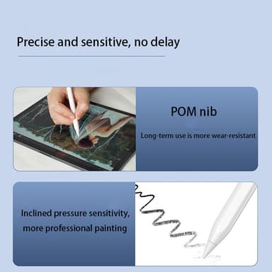 Kosketuskynä kapasitiivisille näytöille tableteissa, kuten iPad, iPad Mini, iPad Air ja iPad Pro. Kärki voidaan vaihtaa, mukana 4 kärkeä. Ladataan mukana tulevalla USB-C-kaapelilla.Tutustu ominaisuuksiin