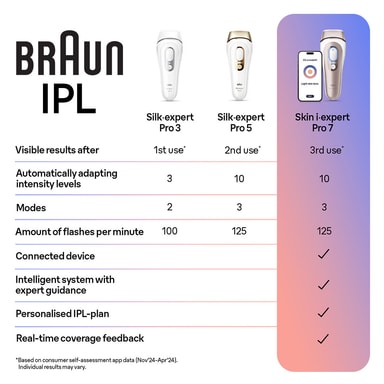 Poista kehon karvat ja nauti sileästä ihosta kotonasi Braun Silk·expert Pro 3 IPL -valoimpulssilaitteella. Tämä laite käyttää uusinta IPL-teknologiaa ja tuottaa tuloksia jopa vain neljässä viikossa karvojen kasvusta ja tekstuurista riippuen.Tutustu ominaisuuksiin