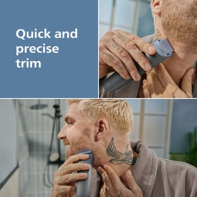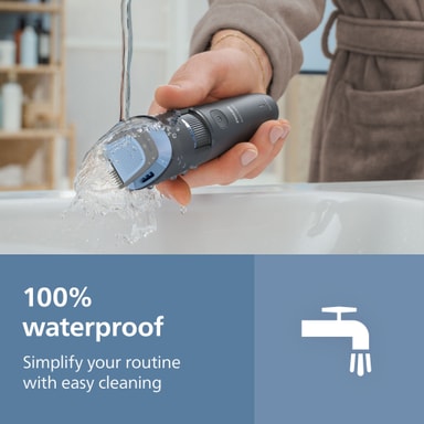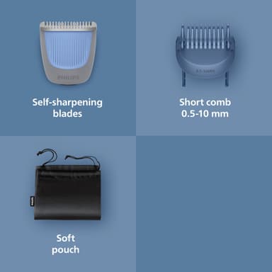 Philips 3000 Series -partatrimmerissä on itseteroittuvat terät ja 20 pituusasetusta. Se tarjoaa jopa 60 minuuttia langatonta käyttöaikaa ja on täysin vedenkestävä. Pakkaus sisältää säädettävän kamman, USB-A-laturin ja puhdistusharjan.Tutustu ominaisuuksiin