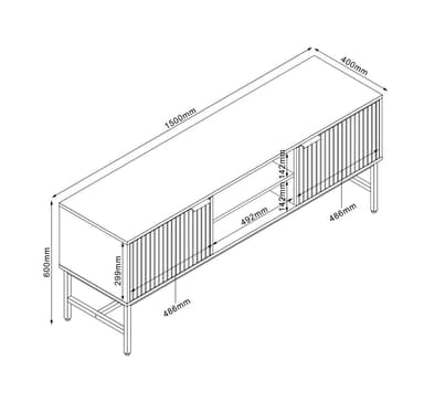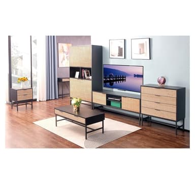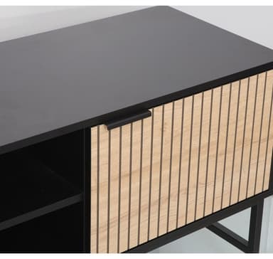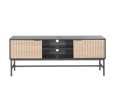 TV-taso HELVE 150x40xK60cm. Materiaali: melamiinilevy. Väri: musta / vaalea puu. Jalat ja runko ovat metallia ja viimeistelty mustalla pulverimaalilla.