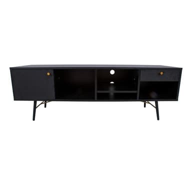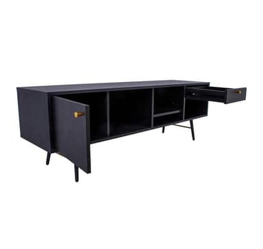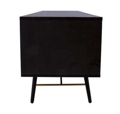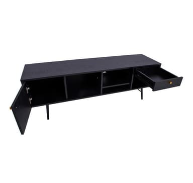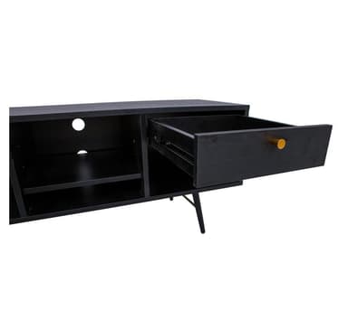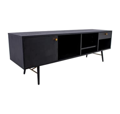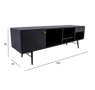 TV-pöytä LUXEMBURG 150x40xH50cm, musta / kupari. Materiaali: melamiinilevy, väri: musta. Kuparinvärinen metallirunko. Pehmeästi sulkeutuvat saranat ja laatikkoliu’ut. Kuparinväriset alumiinikahvat.