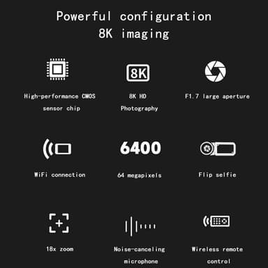 8K kädessä pidettävä digitaalikamera tarjoaa upean kuvanlaadun, 18x zoomin ja WiFi-yhteyden. Täydellinen matkoille, vlogien tekemiseen ja tärkeiden hetkien tallentamiseen. 64MP, F1.7 aukko.Tutustu ominaisuuksiin