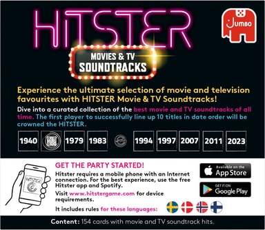 Jumbo Hitster Nordic Soundtracks -bilepeli on musiikkipainotteinen korttipeli 2–10 pelaajalle, jossa skannataan ääniraitakortteja sovelluksen avulla ja arvataan, milloin elokuva- tai TV-kappaleet julkaistiin. Pelissä on yli 150 ääniraitakorttia.Tutustu ominaisuuksiin