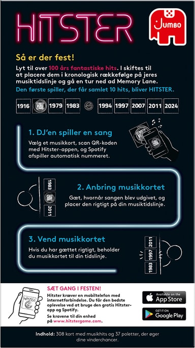 Jumbo Hitster Original Danish Soundtracks -korttipelissä on hittibiisikortteja viimeisen 100 vuoden ajalta. Käytä mobiilisovellusta skannataksesi ja soittaaksesi kappaleita, ja arvaa sitten julkaisuvuosi tai artisti, tai aseta kappaleet aikajanalle.Tutustu ominaisuuksiin