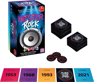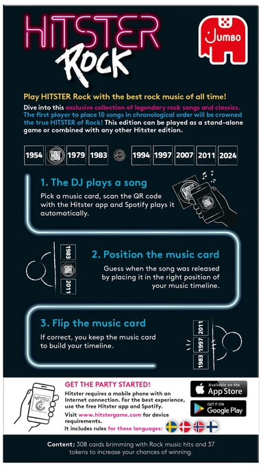 Jumbo Hitster Rock Soundtracks -korttipelissä on 300 rock-hittiä. Käytä mukana tulevaa sovellusta skannataksesi ja soittaaksesi kappaleita, arvaa sitten julkaisuvuosi, artisti tai järjestä kappaleet aikajanalle.Tutustu ominaisuuksiin