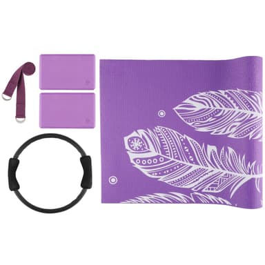 Du kan använda det för meditation, stretching och stärkande övningar. Perfekt för att koppla av eller ladda upp. Setet innehåller en yogamatta 173 x 61 x 0,4 cm, två yogaklossar, ett yogaband och en pilates ring.