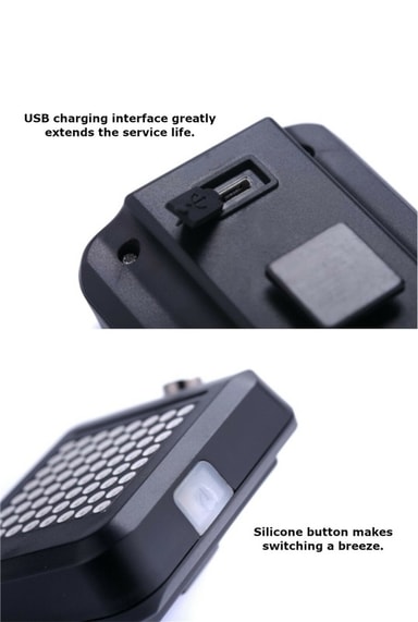 1200 mAh:n litiumioniakku latautuu täyteen 3,5 tunnin latauksen jälkeen USB-liitännän kautta, ja se on yhteensopiva useimpien puhelinlatureiden, virtapankkien, kannettavien tietokoneiden ja tietokoneiden kanssa. Mukana on säädettävä silikonikumihihna, joka voidaan kiinnittää useimpiin polkupyöriin. Tekniset tiedot: